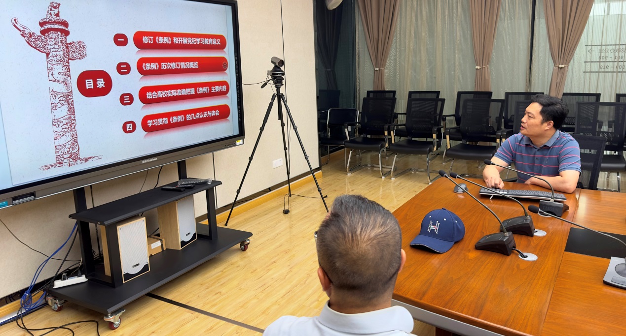院党委书记薛保山领学了《中国共产党纪律处分条例》,并进行了解读。薛保山概览了《条例》历次修订情况,阐述了结合高校实际需要准确把握的《条例》内容,以及学习贯彻《条例》的几点认识与体会,最后号召学院全体党员干部要在服务党和国家大局中学习领会条例的主旨要义,培养遵纪守纪的自觉。