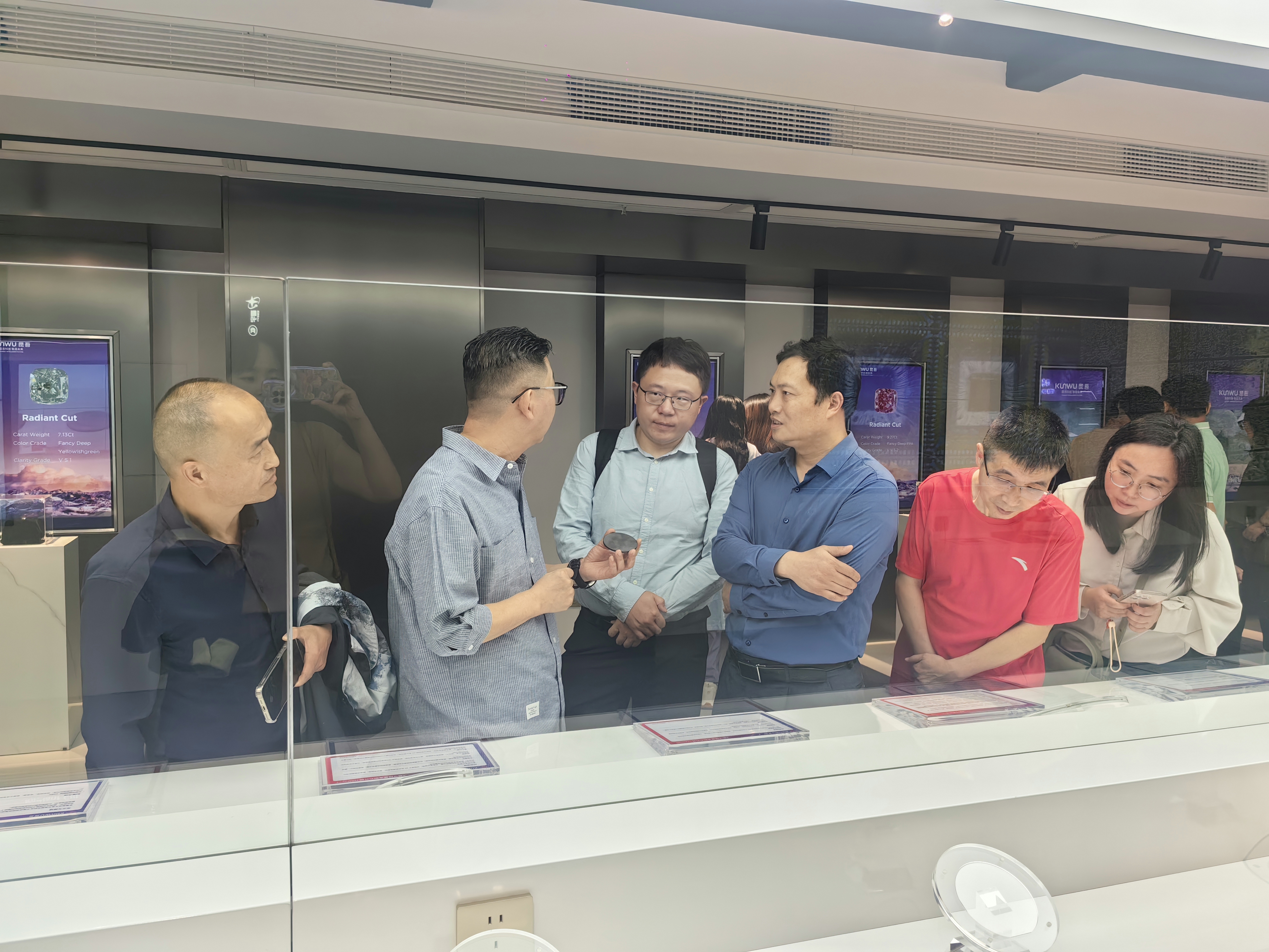 为增强党建与业务工作的深度融合,活动特意安排赴昆吾先进材料(江西)有限公司参观和调研。该公司聚焦第四代宽禁带半导体材料研发与生产,引进国际先进设备,建设年产10万克拉大尺寸金刚石半导体材料基地,展现了我国在新材料领域的前沿布局与科技自立自强的发展方向。双方围绕培育钻石分级与质量控制、跨文化品牌建设、智能设计体系、彩钻光学优化、材料科技融合及研究生联合培养等方面展开深入探讨,积极推动产学研深度融合。
