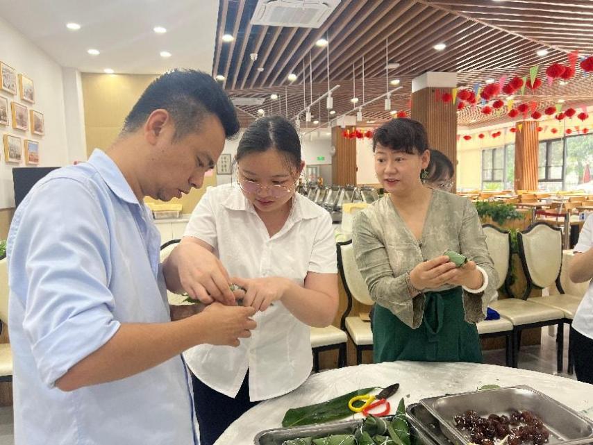 在活动现场,成员们在指导下进行粽子的制作,包括剪裁粽叶、折叠成三角形、填充糯米、加入蜜枣、压实粽子形状以及绑扎棉绳。大家在交流包粽子技巧的同时,也愉快地分享各自独特的粽子造型,现场洋溢着热烈的气氛。此次活动富含传统文化的深厚底蕴,同时兼具生动趣味,不仅使参与者收获满满,更激发了大家对传统文化的热爱之情,是一次弘扬和传承我国的优秀传统文化、增强文化自信的重要体验。