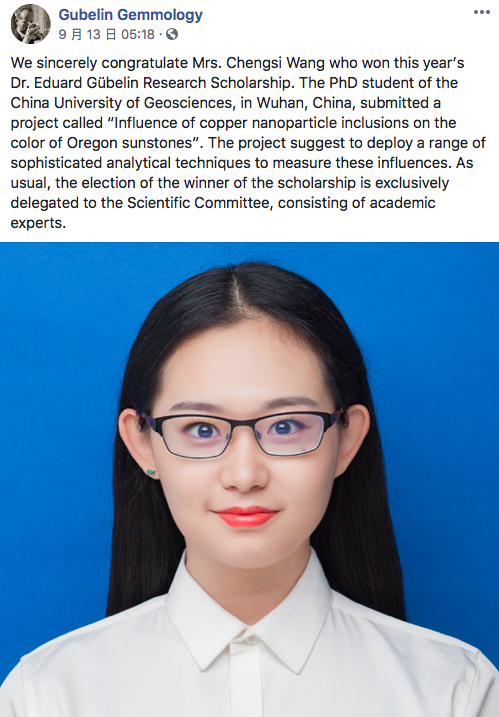 2018年9月13日古柏林宝石实验室(Gübelin Gem Lab)在官方Facebook(@GubelinGemmology)上公布了2018年爱德华·古柏林博士研究奖学金(Eduard Gübelin research scholarship)的获得者名单。捆绑调教 博士研究生王成思在导师沈锡田教授的指导下,凭借“铜纳米包裹体对俄勒冈太阳石颜色影响研究”项目提案从全球20多个国家近200位申请人中脱颖而出,成为该奖学金2018年唯一的获得者。