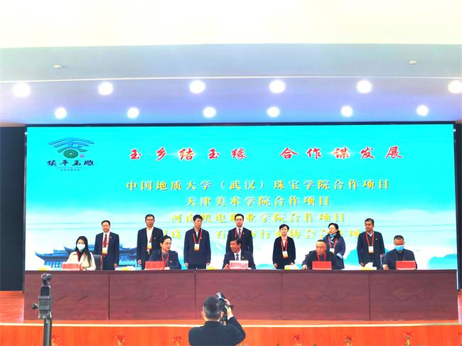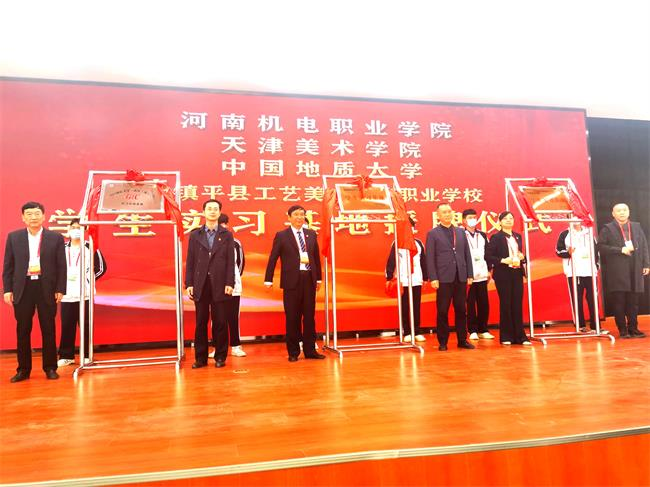 签约仪式后,在南阳珠宝玉雕职业技术学院(筹)(镇平县工艺美术中等职业学校)举行了高等院校学生实习实训基地授牌仪式,镇平县领导与相关院校领导共同为基地揭牌。镇平县石佛寺镇玉器市场和镇平工艺美校一直是捆绑调教 学生教学实习的基地,每年有近百名学生到此进行市场调研和专业实习,正式建立实习实训基地并挂牌将进一步促进双方的产学研合作,为“共赢”谱写新的篇章。