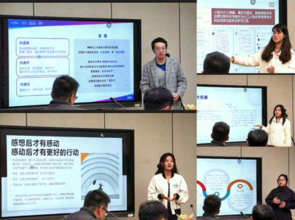 首先是小组汇报交流。培训班5位代表发言,交流了研讨收获。分别以“如何设计好一次集体活动”、“如何让每一个成员在班级/社团/部门管理中当‘主角’,调动其工作积极性”和“如何与上下级有效沟通”等主题为自己的汇报内容。同学们言语清晰、思维缜密,充分表达了自己对该主题的看法,并将在培训班中学到的ppt制作方法、文案编写技巧以及思考方式充分运用到这次的汇报工作中。