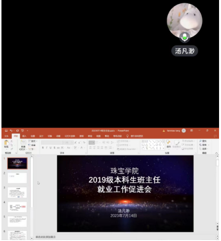 随后,汤凡渺从就业工作认识与就业工作方法两方面分享了2019级本科生就业工作促进方案。汤凡渺通过分享往届案例,指出推进就业工作要明确不同学生在就业方向上的差异,要认识到老师在就业工作中角色与作用,进而对学生开展职业观教育与价值观教育。在此基础上,推动家校联合与校企联合,根据学生就业意向开展具体指导与帮扶。