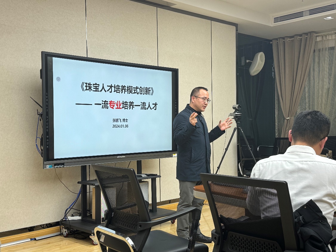 张鹏飞老师以《宝石人才培育创新,一流专业培养一流人才》为题,分享了他在教学工作中的感悟,汇报了2023年夏季访企拓岗工作期间的调研情况,为未来珠宝人才需求和培育模式带来了许多新思考。