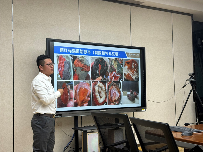 王朝文副教授以《南红玛瑙的形成、鉴定和颜色分级》为题,向与会师生介绍了他多年来在南红玛瑙方面积累的相关研究工作。他从“玛瑙”的词源开始,围绕玛瑙在中华文明探源中的重要考古价值、地质成因、地理分布、鉴定特征、分级工作展开了系统介绍。