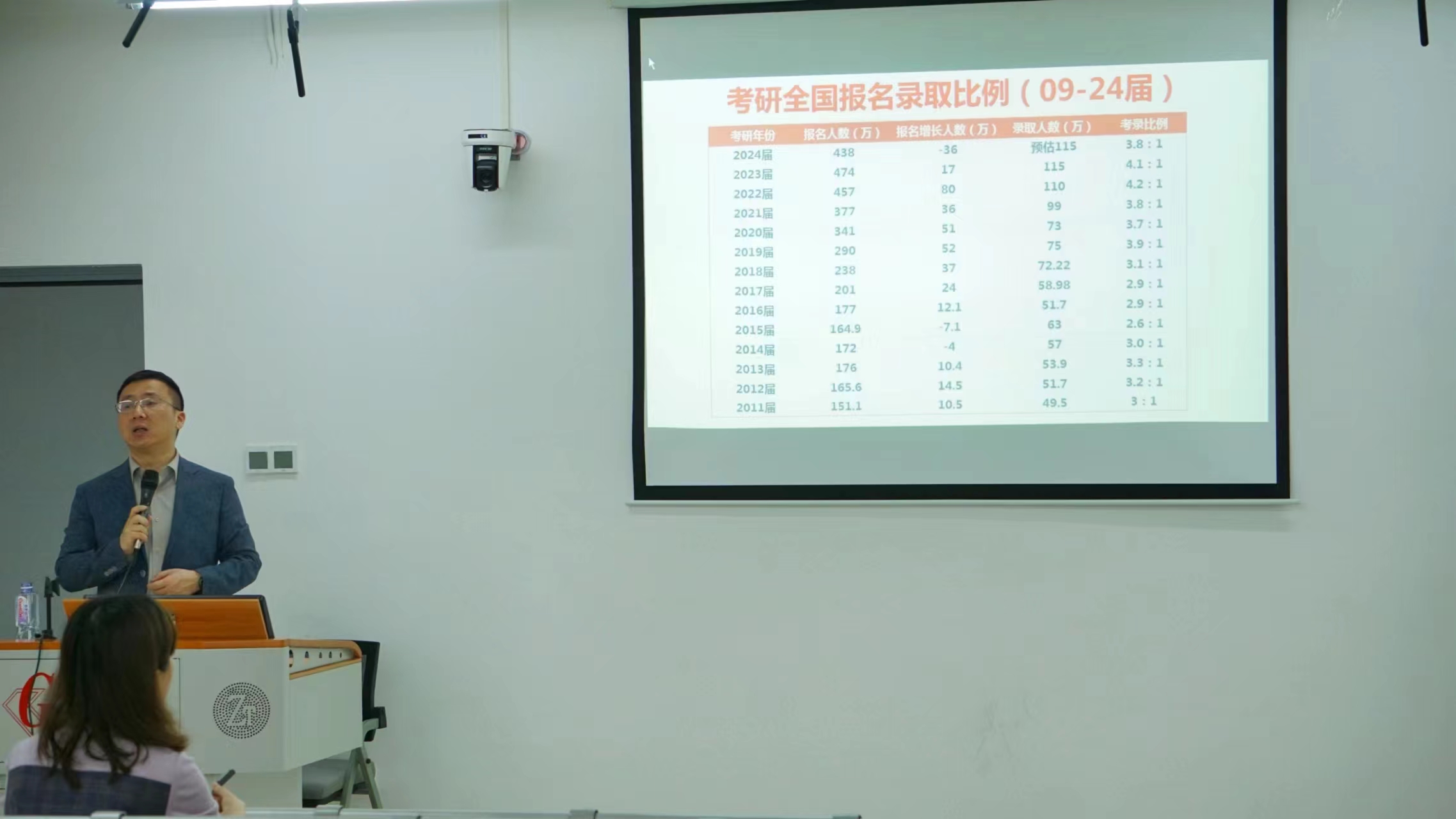 谭校长首先以研究生与公务员考录比为例进行比较分析,指出研究生考录稳定,未来将成为标配学历。他提醒,考研看似艰难,但找对方法就能事半功倍。历届考生落榜多有三因:一、有效备考时间不足,备考不充分。二、院校、专业、地区信息不对称,报考扎堆。三、备考不够科学。因此,他建议同学们充分准备时间,全面收集信息,科学合理备考。大二,大三为考研关键期,应抓住机遇,积极备考。