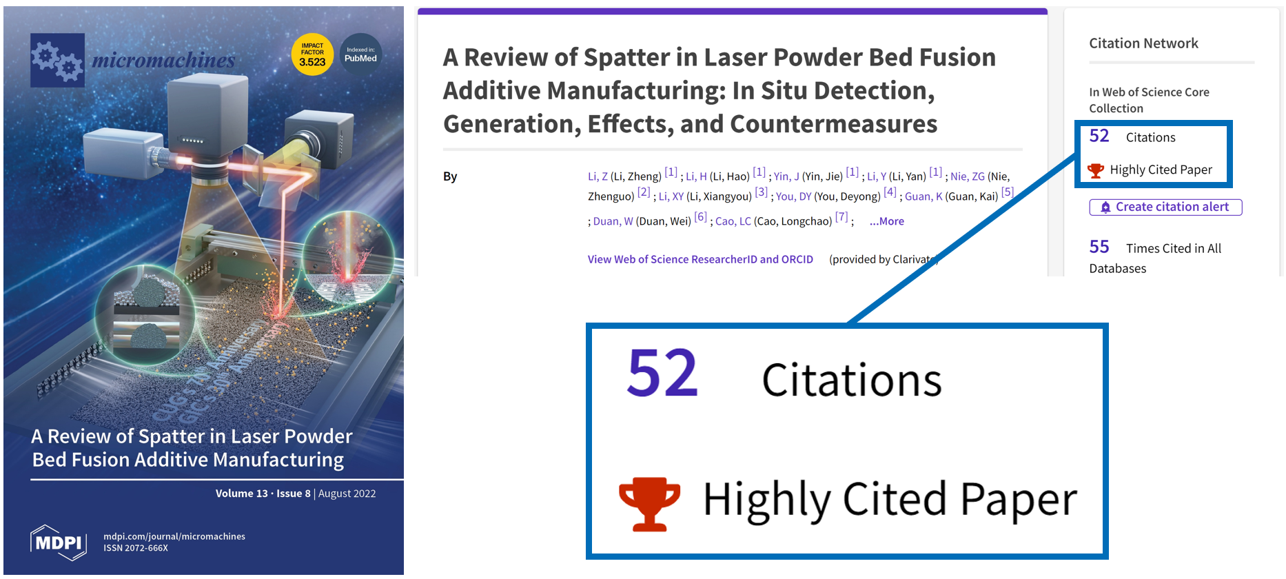 文章一经发表,便受行业广泛关注,Science作者Wayne E. King教授亲自发信祝贺。截至目前,文章累计阅读7670次,在Web of Sciences被引频次达到Engineering领域前1%(52次)入选高被引论文。施引期刊包括International Journal of Extreme Manufacturing(IF:14.7),International Journal of Machine Tools and Manufacture(IF:14),IEEE Transactions on Industrial Informatics(IF:12.3)以及Additive Manufacturing(IF:11)等11篇十分以上期刊,其中得到了中国工程院谢建新院士(北京科技大学),英国皇家工程院Peter D. Lee院士(伦敦大学学院)以及瑞典皇家工程科学院Lars Nyborg院士(查尔姆斯理工大学)等院士团队的正面评价。这充分展现了捆绑调教 科研成果在激光增材领域的影响力和指导意义。