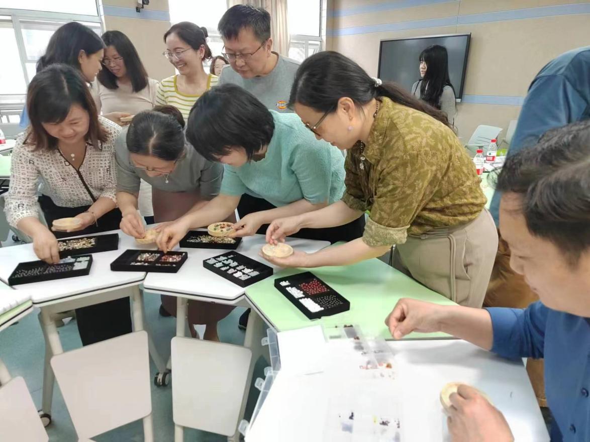 随后老师们在志愿者的帮助下体验串珠,感受串珠的乐趣与美感。活动最后老师们纷纷发表感悟,“我在过程中看到,不同老师选择的不同搭配代表了不同的审美意趣”杨钊老师分享:”每个人在串的过程会不断的思考、交流怎么串会更加好看,从而产生延续下去美的想法,让人感到纯洁、沉静,这就是这个活动的魅力所在。”