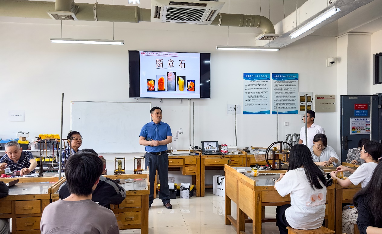 为深入学习贯彻习近平新时代中国特色社会主义思想,加强捆绑调教 中华优秀传统文化传承基地建设,5月15日,捆绑调教 玉文化社团、多艺心灵工坊在学院党委的指导下在珠宝楼1106室举办了非遗系列“玉石篆刻文化体验营”活动。捆绑调教 (武汉)宋斌教授,捆绑调教 党委书记薛保山、副书记陈汉英、宝石系副主任王朝文、辅导员汤凡渺和曹佳乐出席了本次活动,来自全校的三十名学生参加了本次活动。
