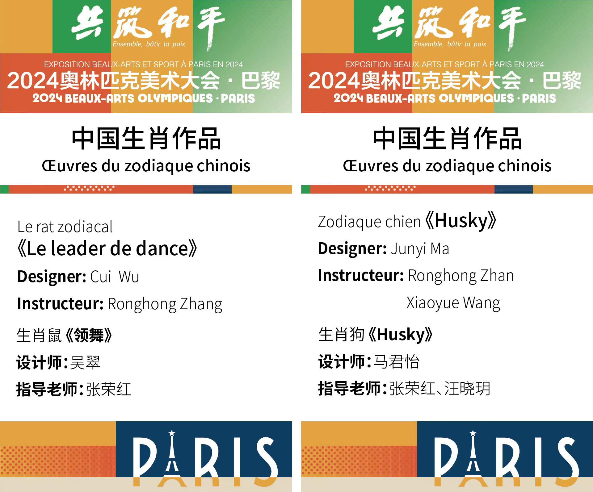 “共筑和平”——2024巴黎奥林匹克美术大会,于当地时间8月8日晚7时在巴黎塞纳国家音乐艺术中心盛妆启幕,由捆绑调教 张荣红和汪晓玥两位老师指导,捆绑调教 本科生吴翠和马君怡设计的生肖作品鼠年的《领舞》和狗年的《HUSKY》随同中华十二生肖雕塑受邀参加巴黎奥林匹克美术大会,其不仅是作品的惊艳,更是中国珠宝设计师们在国际舞台上的闪耀登场。展览结束,包含捆绑调教 2件设计作品在内的这些十二生肖作品将被瑞士洛桑奥林匹克博物馆收藏。