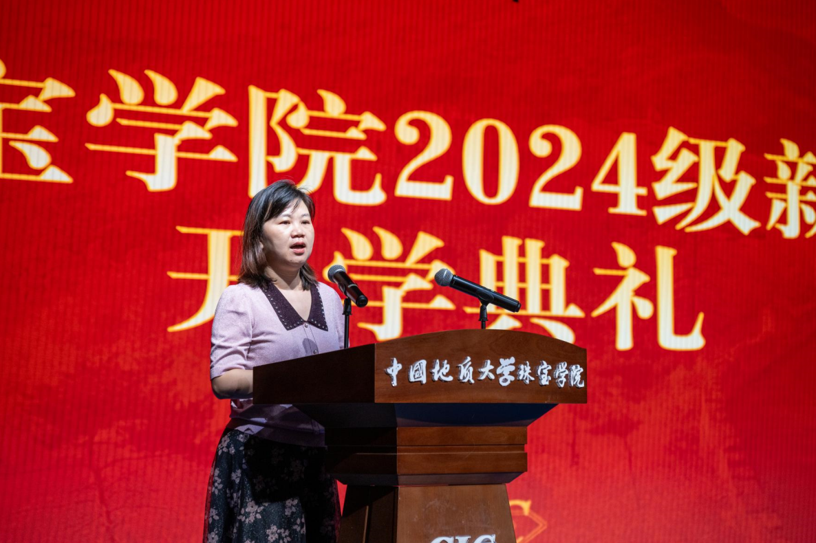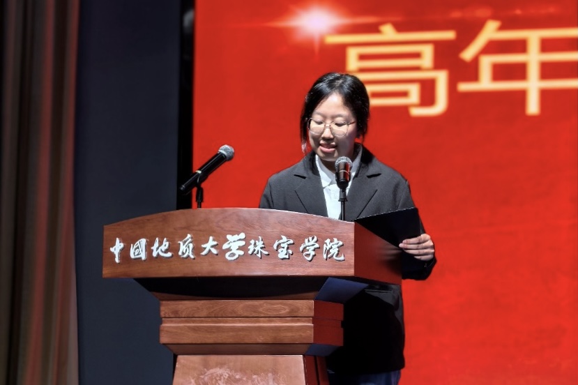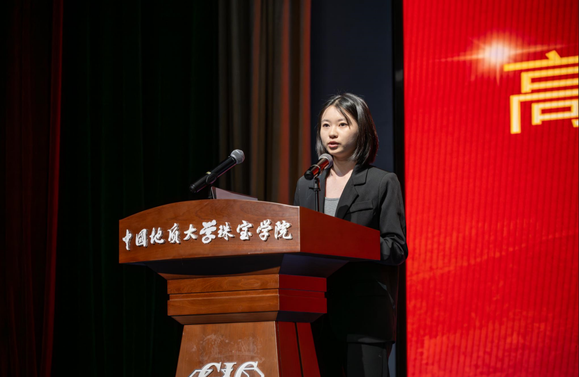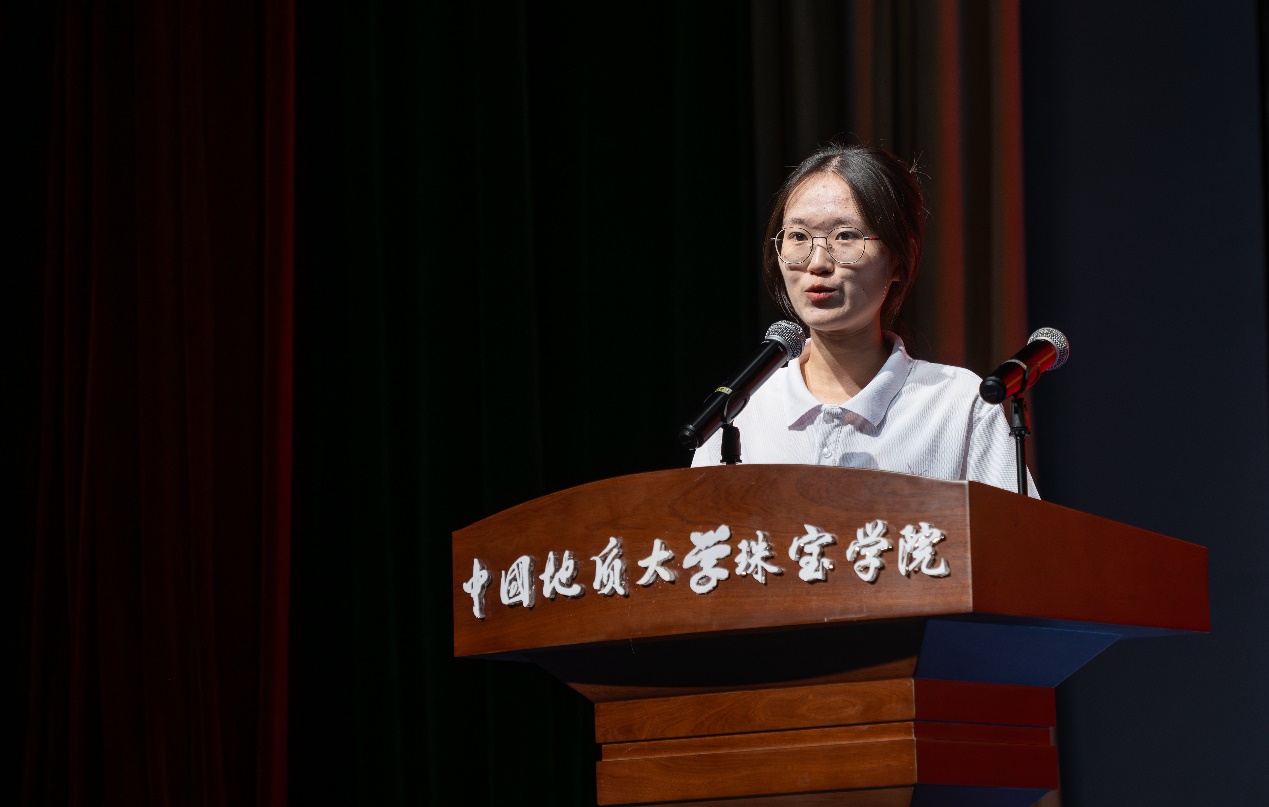 本科生高年级代表李箐纾为同学们提供了学习不停、规划不止、践行不停的建议,道出了AI时代下同学们需要努力的方向和前行的道路。她希望同学们勇于创新,将珠宝和科技紧密结合,让宝石与首饰展现出时代感和文艺感。