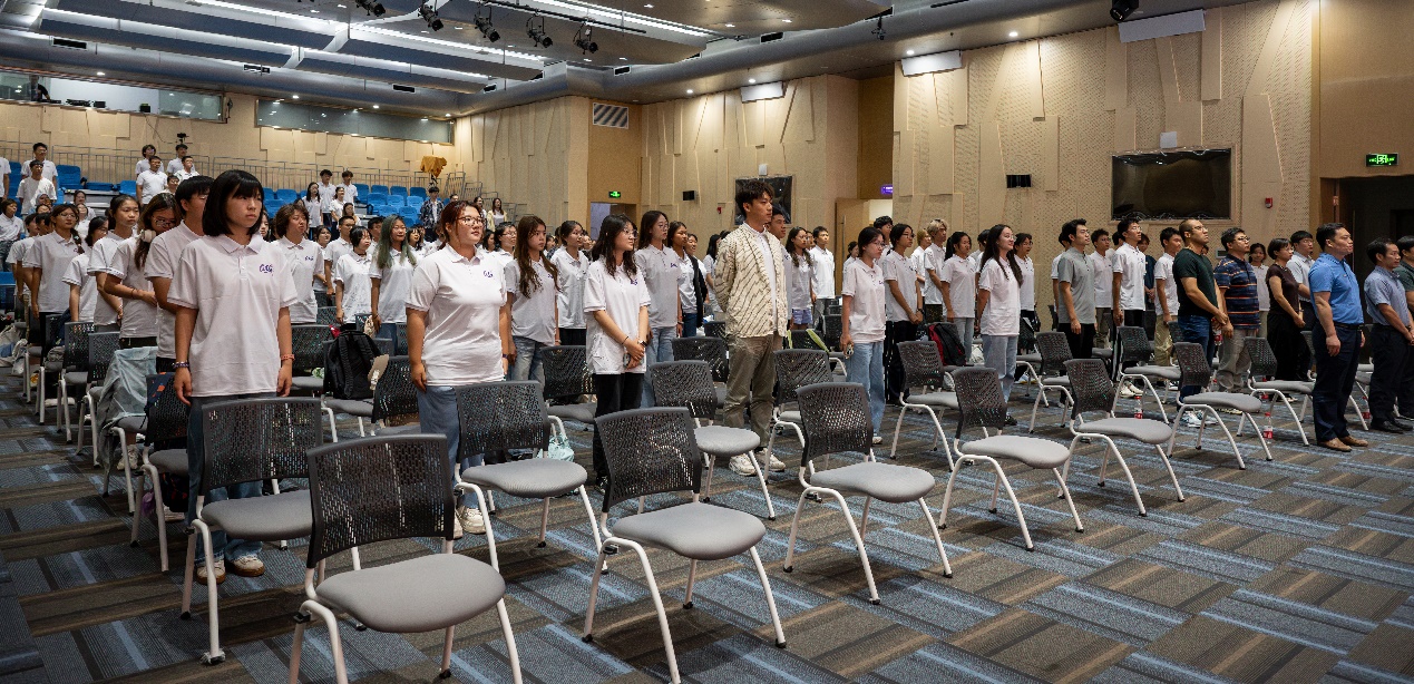 全场观众一同起立,慷慨激昂地奏唱国歌。师生的爱国之情溢于言表,朝气蓬勃的同学们展现着青春光彩。