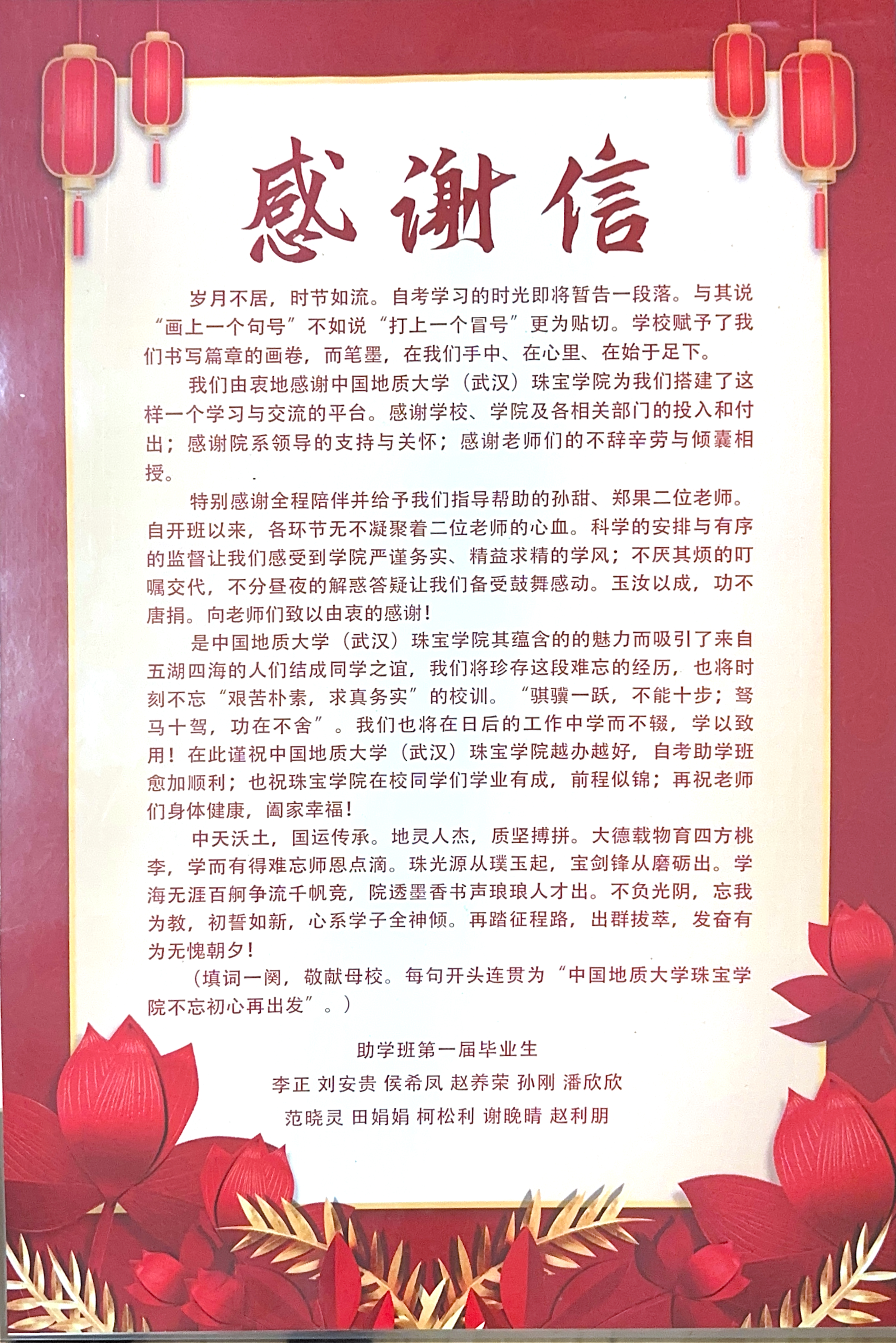 12月9日,捆绑调教 (武汉)捆绑调教 自考办公室收到了学生赠送的特别礼物:两面锦旗以及一封充满深情的感谢信。同学们说:“希望通过赠送锦旗和感谢信,向学院以及孙甜和郑果两位老师表达我们深深的感激之情。长期以来,学院为我们提供了优质的教育和贴心的服务。老师们的热情周到、无私奉献,让我们感受到了家的温暖”。这份礼物是对两位老师辛勤付出的认可,也表达了对捆绑调教 培养之恩的深切感激。