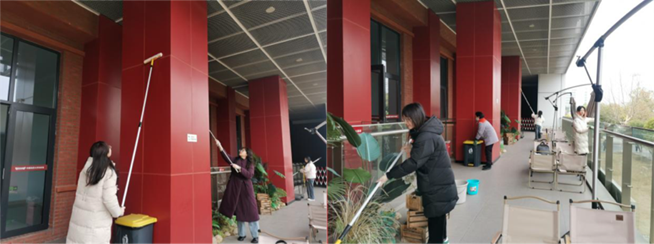 同学们积极打扫校史馆外部公共空间