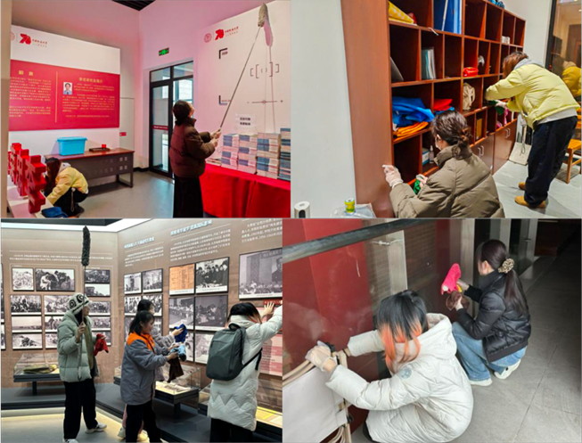 同学们分成多个小组,各司其职,一部分同学前往珠宝楼1014、1015、1016教室进行打扫,另一部分则对校史馆中两侧的阳台、校友展厅、校史展厅等展位展开了深度清洁:擦拭玻璃展板、清扫地面、清洁缝隙处灰尘等,让承载了厚重历史的校史馆焕发出新的活力。