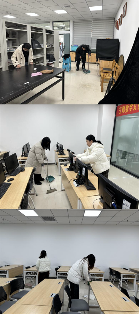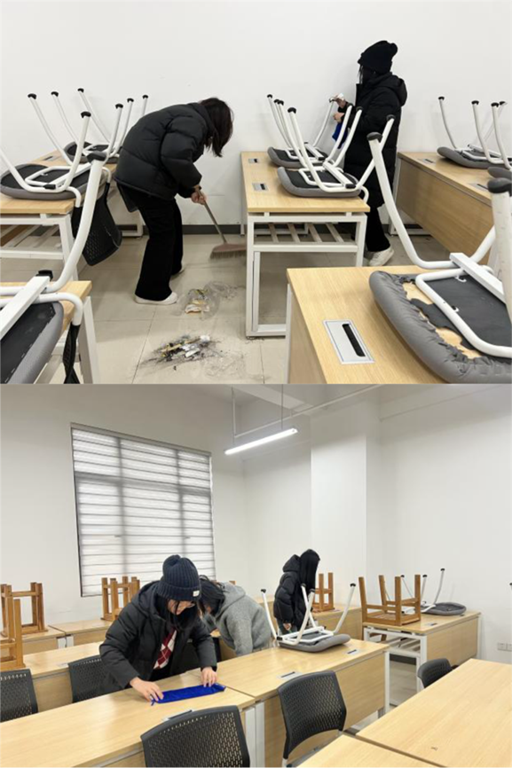 珠宝楼1001教室里,同学们分工明确,热情高涨。有的同学拿着扫帚,仔细清扫地面的纸屑和灰尘,角落也不放过;有的同学拿着抹布,认真擦拭黑板和桌椅,让它们焕然一新。大家互相配合,忙得不亦乐乎。