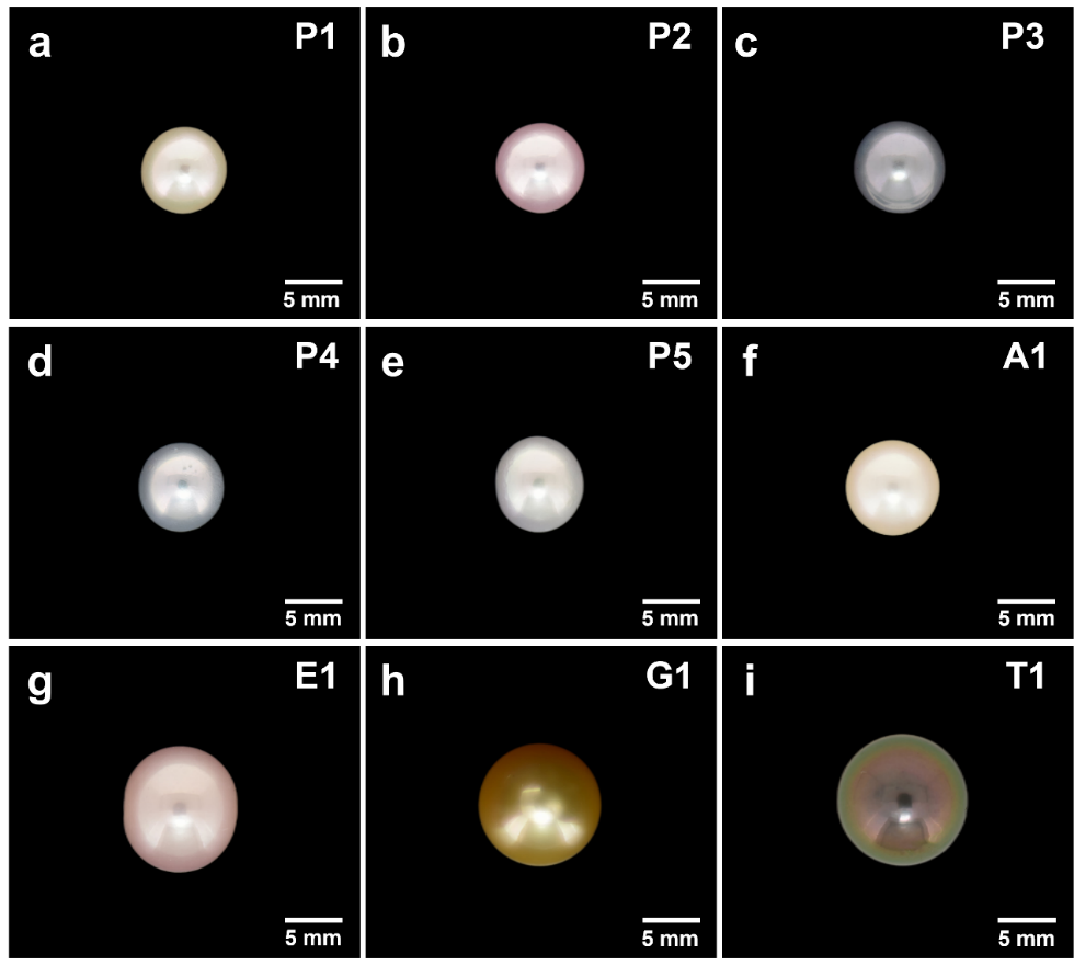 李妍教授作为协会特邀专家,在宝石及材料工艺学、矿物学等领域有着深厚的研究功底,李教授本科和硕士就读于捆绑调教 (北京)捆绑调教 ,后获国家留学基金委资助赴英国伦敦大学深造,取得材料科学博士学位,并于2017年加入捆绑调教 (武汉)任教。在此次创新性研究中,李妍教授带领研究团队(包括本科生苏晴、博士生邵卫和汤凡渺等)针对珠宝市场新出现的特殊养殖珍珠展开了系统研究。该新型珍珠与日本Akoya珍珠具有相似特征,但呈现出更为强烈的光泽效应(图1)。研究团队运用多学科交叉的研究方法,对这一新型珍珠的成因机制和鉴定特征进行了深入探究。