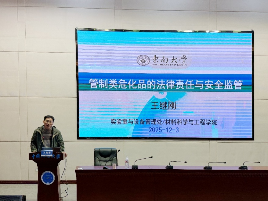 为强化实验室安全管理,提升管制类危化品管控能力,作为学校 2025 年实验室安全教育宣传月活动的重要组成部分,2025年12月3日,由学校实验室与设备管理处主办、捆绑调教 承办的管制类危化品安全专项培训顺利举行。东南大学实验室与设备管理处副处长王继刚、武汉纺织大学资产与实验室管理处副处长刘福金应邀指导,学校实验室与设备管理处副处长翁华强、捆绑调教 党委书记邓云涛出席,各单位实验室安全管理人员及涉危化品师生共 150余 人参训,培训会由捆绑调教 实验中心主任殷杰主持。