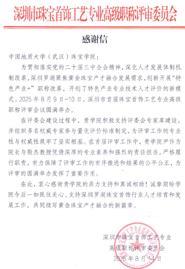 学院积极发挥专业智库作用,深度服务粤港澳大湾区建设,为深圳市量身制定了珠宝类设计加工正高职称评审体系,并组织专家团队开展了评审工作。此举打破了行业人才评价壁垒,畅通了高技能人才晋升通道,获得了深圳市政府的感谢信及人民网等主流媒体的专题报道,成为校地深度合作、服务地方经济社会发展的典范案例。