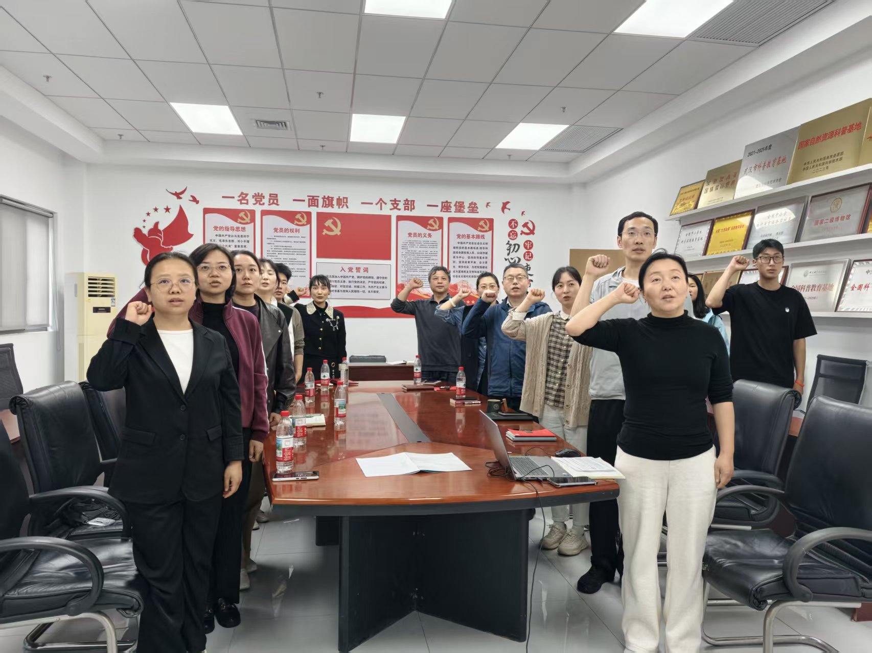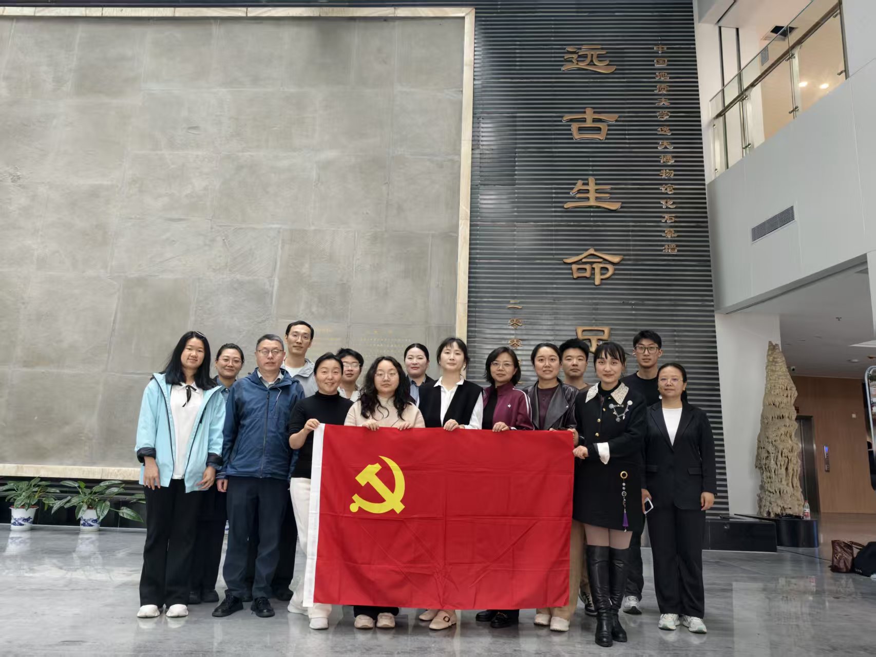 本次活动共设置四个环节。第一环节为展厅导览,全体党员集体参观博物馆矿物宝石、地质演化、生命演化等核心展区。将专业课堂“搬”到博物馆展厅,让教师党员和学生党员在实物面前重新审视矿物形成与珠宝原石的地质成因,既深化了专业认知,也真切感受到自然科普与珠宝文化传承的内在联系,为后续教学科研积累了鲜活素材。第二环节为博物馆党建展示,宋艳芳围绕博物馆党建工作特色,系统介绍了支部以科普教育为载体、以党建引领展陈服务的实践路径、特色项目及成效。舒骏认为,博物馆党支部“党建+科普”的融合模式具有很强的借鉴意义,为教工支部如何结合专业优势开展党建活动提供了新思路。第三环节为专题分享,宝石学生第三党支部党员方婷以《博物馆志愿工作的实践与成长》为题,结合自身在博物馆的讲解实践,生动讲述了在党旗下参与志愿服务、锤炼专业能力、践行党员宗旨的收获与体会。丁苗苗认为,同学们在志愿讲解中实现了专业能力与党性修养的双重提升,这正是党建引领育人的生动写照。第四环节为活动总结暨重温入党誓词,由舒骏领誓,全体党员面向鲜红党旗庄严重温入党誓词,进一步强化身份意识与责任担当。