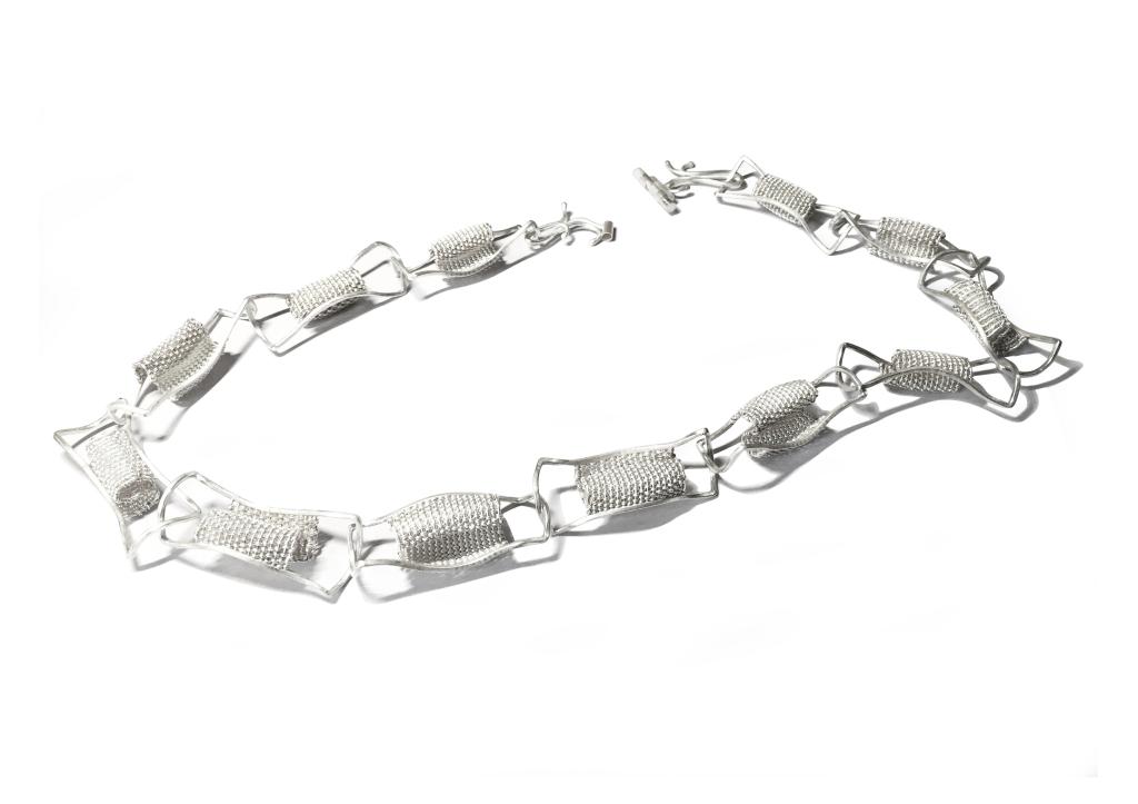 闫政旭老师创作构思:《行织有道》这套作品以金属编织作为主体工艺,其技法脱胎于传统细金工艺中的花丝工艺。其中“堆、累、编、织、掐、填、攒、焊”是该工艺的核心技法。此套作品将编、织、焊等技法运用到艺术创作当中,实现了传统工艺的现代设计转译,鉴古但不泥古,展示了创作者在传统工艺中寻求创新的探索精神。