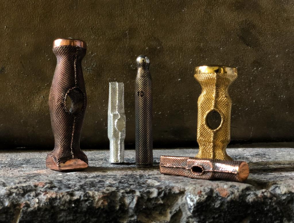 任开老师创作构思:日本民艺大师柳宗悦说:“工艺的美是用之美”。乌黑的工具上一道道划痕与残缺体现的是岁月凝固之美和使用者的生命印记。当“工艺”由名词转为动词时,在工艺世界的逻辑中,“万物生长”的过程就展现了每一种工艺特有的痕迹之美。《工艺痕迹》这个作品主要运用了花丝工艺中“泡匹”这样一种工艺形式来创作。它以我们金属工艺人天天用到的工具作为母形创作而来,并借用了当代花丝工艺创作过程中留下的独特工艺痕迹纹理来表达工具与人内在关系上的特殊意义。