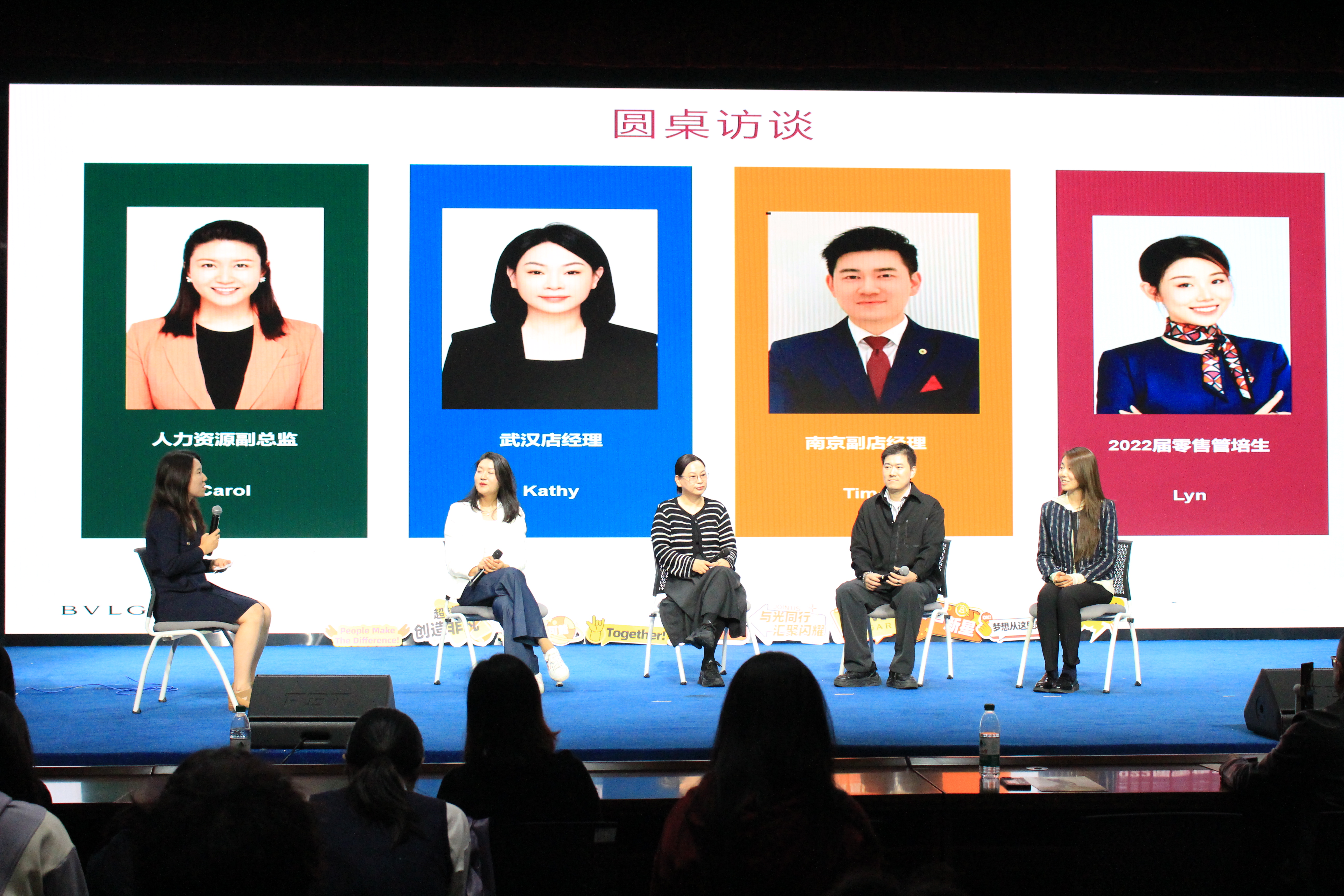 公司5位嘉宾于场上就坐,开展了一场别开生面的圆桌访谈。武汉恒隆及SKP店经理Kathy ZHANG分享了她在门店与同事们的相处经验,优秀员工代表—南京IFS店铺副经理及Top sales员工Timo WANG分享了自己跨专业转行做销售的心路历程。2022年零售管理培训生Lyn JIN作为捆绑调教 毕业生学姐分享了从一个珠宝设计的学生到宝格丽培训生的切身体验,生动展示了奢侈品行业的独特魅力与发展机遇,拉近了公司与毕业生之间的距离。